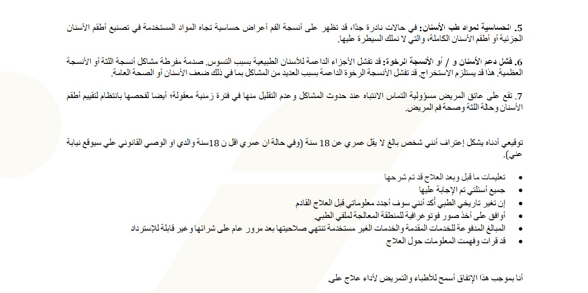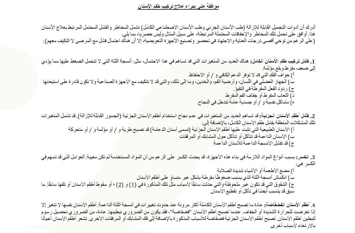 I agree to assume those risks and possible failures associated with, but not limited to, the following: (Even though the utmost care and diligence is exercised in preparation for, and fabrication of, prosthetic appliances, there is the possibility of failure with patients not adapting to them):